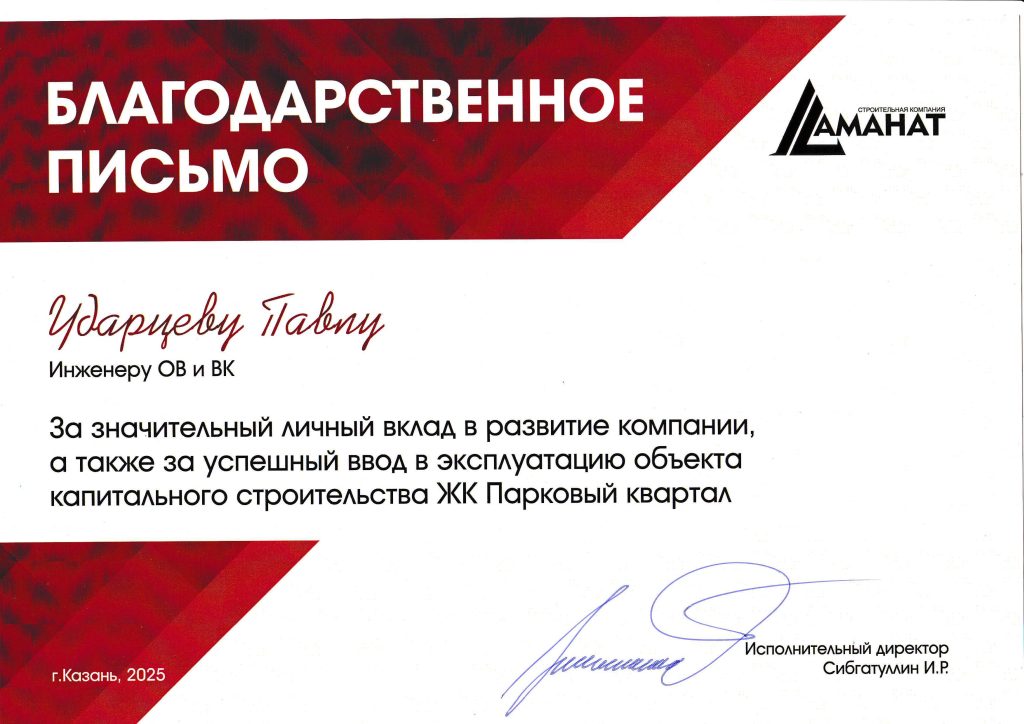 ООО «Строительная компания Аманат» поблагодарила Павла Ударцева за значительный вклад в развитие компании, а также за успешный ввод в эксплуатацию объекта ЖК «Парковый квартал».